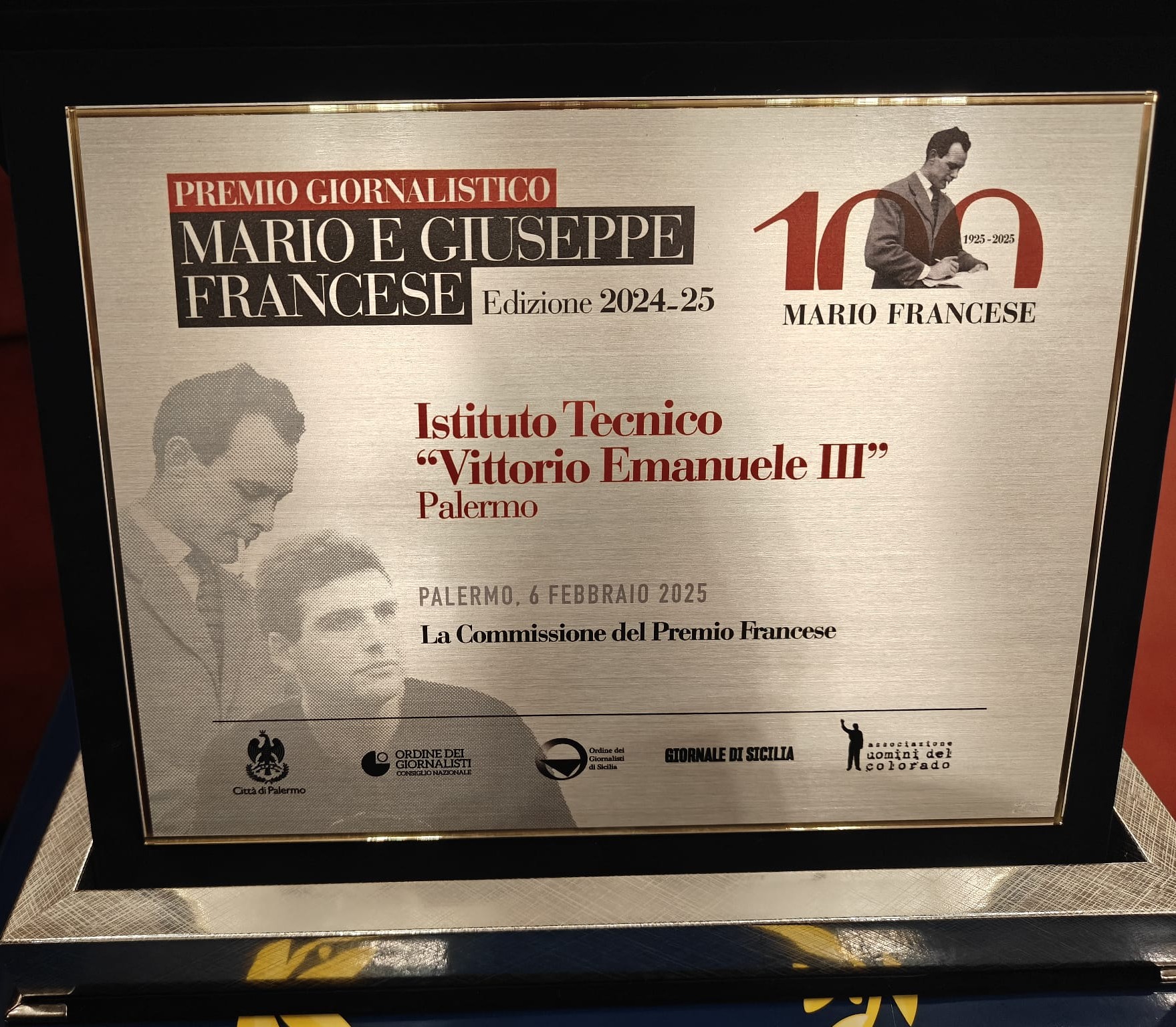 Il 6 febbraio 2025 gli studenti della 3A Meccanica, sotto la guida della prof.ssa Fasoni e del prof. Salvaggio, hanno vinto il prestigioso premio giornalistico “Mario e Giuseppe Francese”, grazie ad un cortometraggio dal titolo “LUOGHI”, classificandosi primi tra numerose scuole siciliane e non.